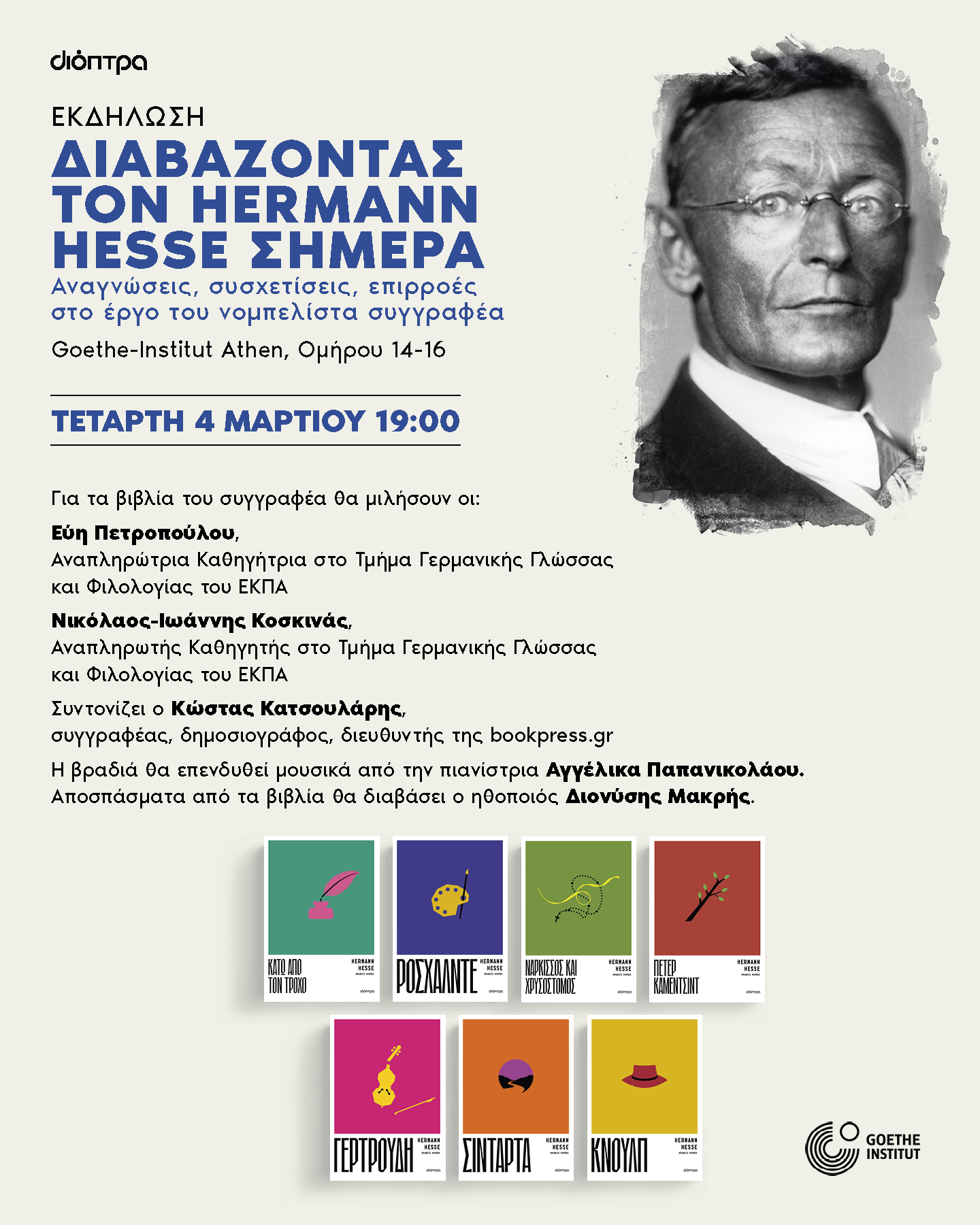 Το Goethe-Institut Athen και οι Εκδόσεις Διόπτρα σας προσκαλούν σε μια εκδήλωση για το έργο του νομπελίστα Herman Hesse. Η παρουσίαση θα πραγματοποιηθεί την Τετάρτη 4 Μαρτίου, ώρα 19:00, στο Goethe-Institut Athen (Ομήρου 14-16, Αθήνα).