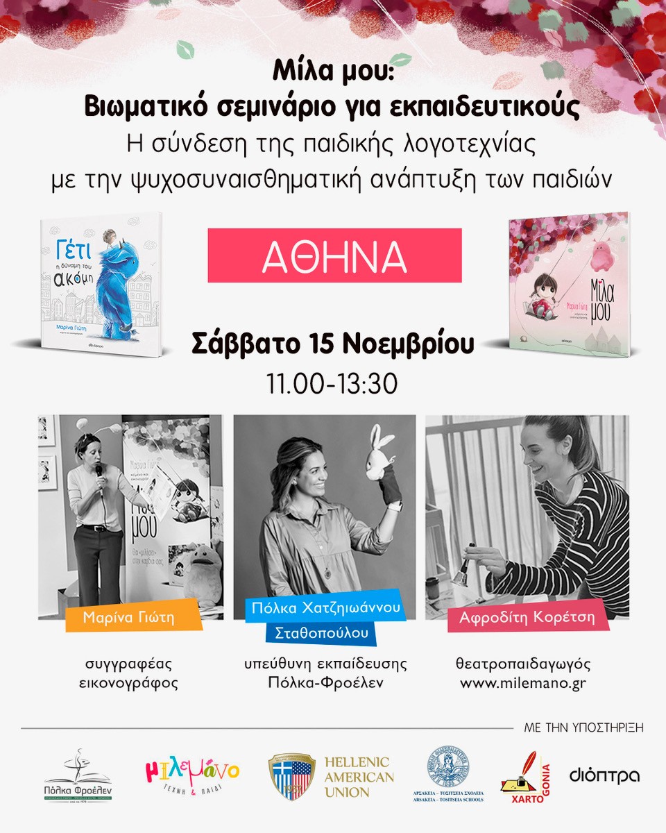 Η βραβευμένη συγγραφέας και εικονογράφος Μαρίνα Γιώτη, η εκπαιδευτικός και υπεύθυνη εκπαίδευσης του Εκπαιδευτικού Οργανισμού Πόλκα-Φροέλεν, Πόλκα Χατζηιωάννου Σταθοπούλου, η θεατροπαιδαγωγός Αφροδίτη Κορέτση, η Ξένια Ι. Παρασκευοπούλου, Προϊσταμένη Συμβουλευτικών Υπηρεσιών στα Αρσάκεια - Τοσίτσεια Σχολεία, Ψυχολόγος, MSc Σχολικής Ψυχολογίας, PhD (cand.) και η Αθηνά Μακροπόδη, δασκάλα, Συντονίστρια Μαθημάτων στα Αρσάκεια - Τοσίτσεια Δημοτικά Σχολεία σε ένα σεμινάριο για επαγγελματίες που ασχολούνται με παιδιά σχολικής και προσχολικής ηλικίας, με στόχο να αναδείξει τα παιδικά βιβλία ως εργαλεία επικοινωνίας και διαχείρισης των συναισθημάτων.
